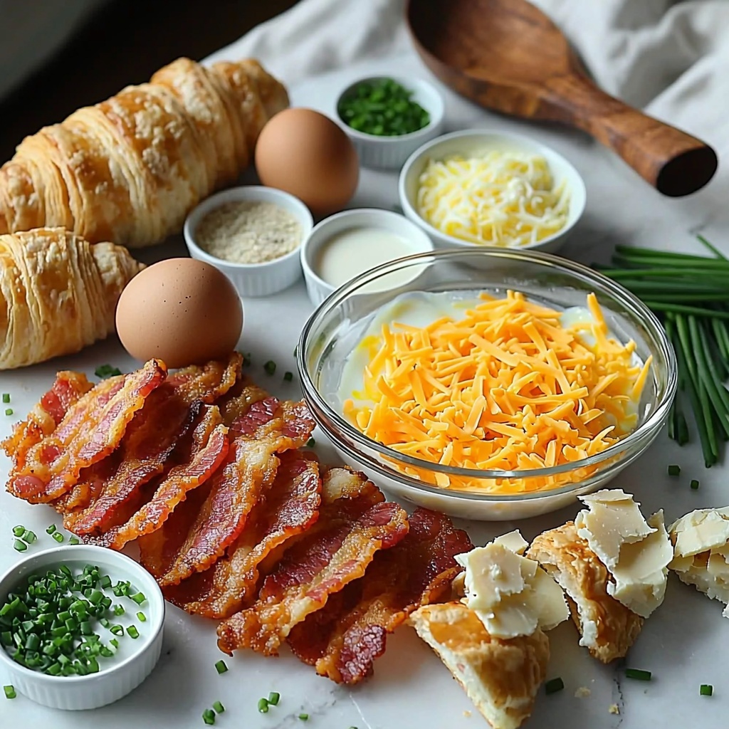 - Assemble and Bake: Pour the egg and cheese mixture evenly over the toasted croissant pieces in the baking dish. Sprinkle the chopped bacon evenly on top, then cover with the remaining shredded cheeses. You may bake immediately or cover and refrigerate overnight for next-day baking.
