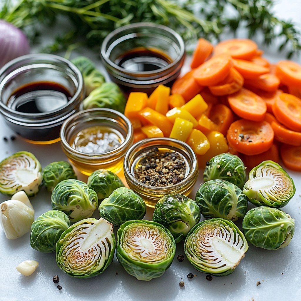 - Prepare the Vegetables: In a large mixing bowl, combine the halved Brussels sprouts, sliced carrots, chopped bell peppers, and sliced red onion, ensuring even distribution of vegetables.