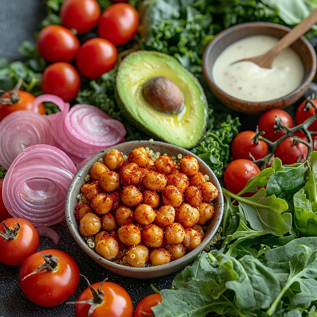 Time to build your bowl! Start by spooning cooked quinoa or rice into your bowl as the wholesome base. Next, add fresh mixed greens for a peppery bite and vibrant color. Top with those perfectly roasted spicy chickpeas, juicy cherry tomatoes, creamy avocado slices, and if you’re in the mood for a bit of tang, scattered pickled onions. Finish with a generous drizzle of your tahini dressing. Serve it right away to enjoy the blend of textures and flavors at their peak.