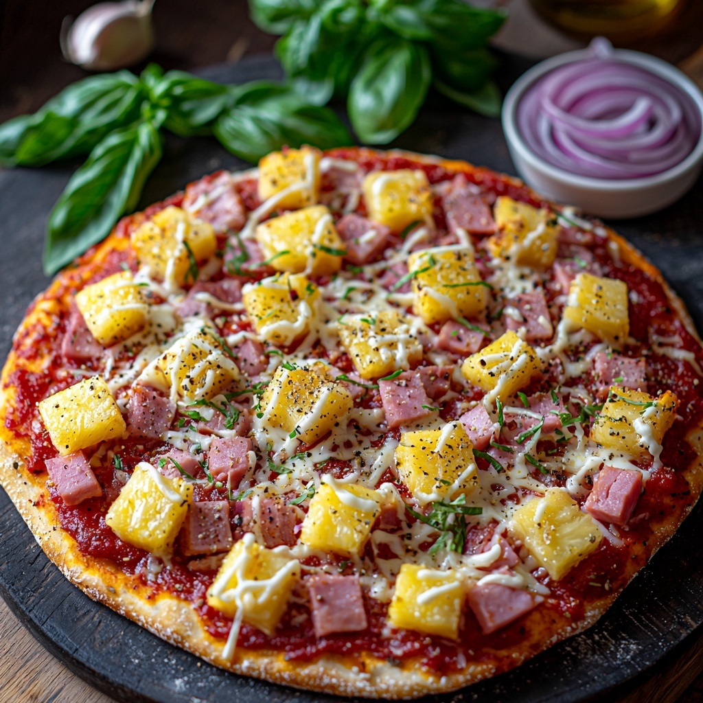 Sprinkle shredded mozzarella cheese generously over your sauce. Then top your pizza with diced or sliced ham, juicy pineapple chunks, and the optional sliced red onion for some extra zing. Finish by sprinkling a touch of garlic powder and dried oregano on top to elevate all the flavors even further.