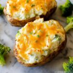 These Cheesy Broccoli Twice-Baked Potatoes are a comforting and satisfying side dish perfect for any occasion. Baked Russet potatoes are scooped out and mixed with cooked broccoli, ranch dressing, sour cream, garlic powder, and cheddar cheese, then stuffed back into the skins and baked again until golden and melty.