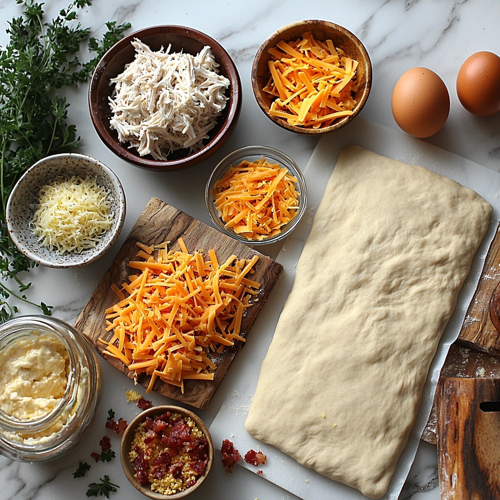 - Add Fillings: Layer the shredded chicken, crumbled bacon, mozzarella, and cheddar cheese evenly over the ranch-covered dough. Sprinkle garlic powder and dried parsley on top to season.