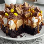Once chilled, smooth the cream cheese whipped topping evenly over the surface of the cake. Then melt the remaining 60 ml of peanut butter and drizzle it generously over the frosting. Use a skewer or toothpick to gently swirl the peanut butter in a marbled pattern that looks as impressive as it tastes. Finally, sprinkle chopped Reese’s Cups and Reese’s Pieces over the top for a festive and crunchy finish that makes this poke cake truly special.