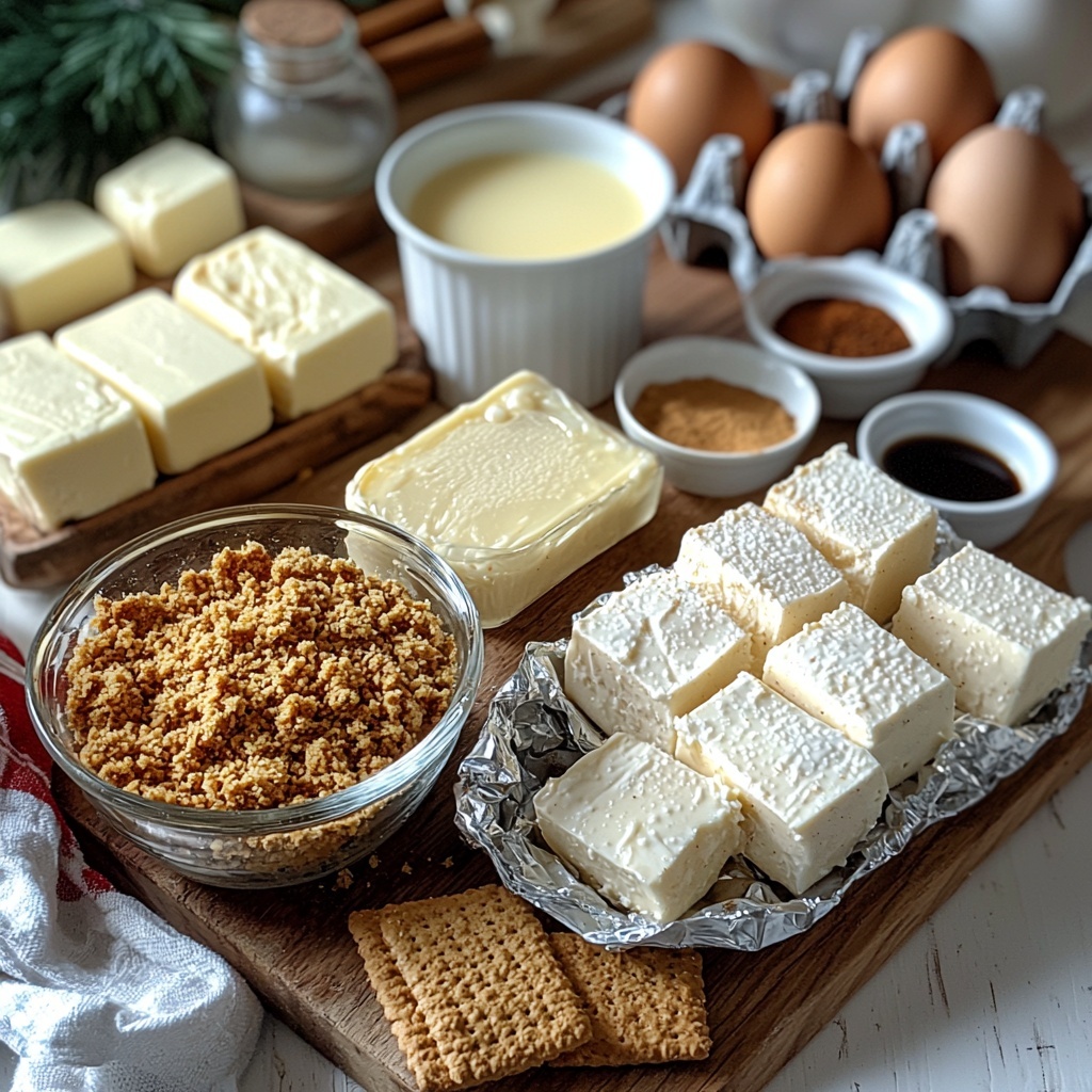 These ingredients are delightfully simple yet essential, each playing a unique role in building the luscious taste and texture of this cheesecake—from the crisp, buttery crust to the rich, spiced filling that embodies the essence of holiday cheer.