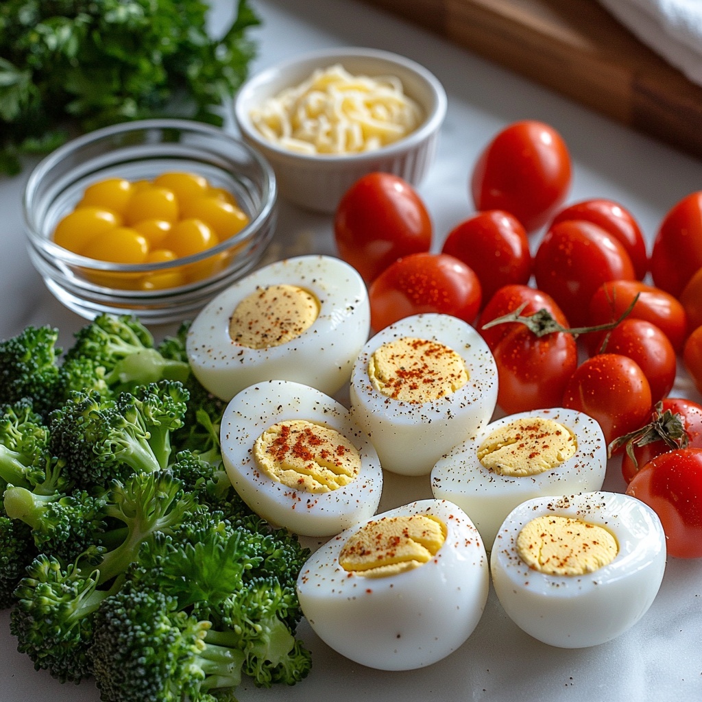 5. Decorate as Christmas trees: Using chopped broccoli florets, cherry tomato halves, shredded cheese, and fresh parsley, decorate the filled eggs to resemble Christmas trees and ornaments, arranging the toppings thoughtfully to mimic festive greenery and baubles.