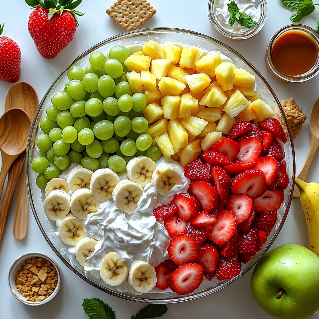 Start by washing all the fruits carefully. Hull and slice the strawberries, chop the green apples just before you mix everything to keep them crisp, halve the grapes, and prepare your pineapple chunks. Slice the bananas only right before serving to prevent browning. Combine all these fresh ingredients gently in a large mixing bowl to keep their integrity intact.