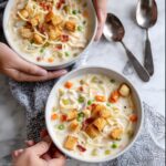 This creamy chicken noodle soup with mini croutons is a comforting, hearty dish perfect for any day. Tender chicken breast is cooked in flavorful bacon fat, combined with veggies, milk, and chicken stock to create a rich broth. Angel hair pasta and sweet corn add texture, while crispy bacon bits and homemade mini croutons provide delightful crunch. Ready in 40 minutes, this soup is a delicious, satisfying meal for the whole family.