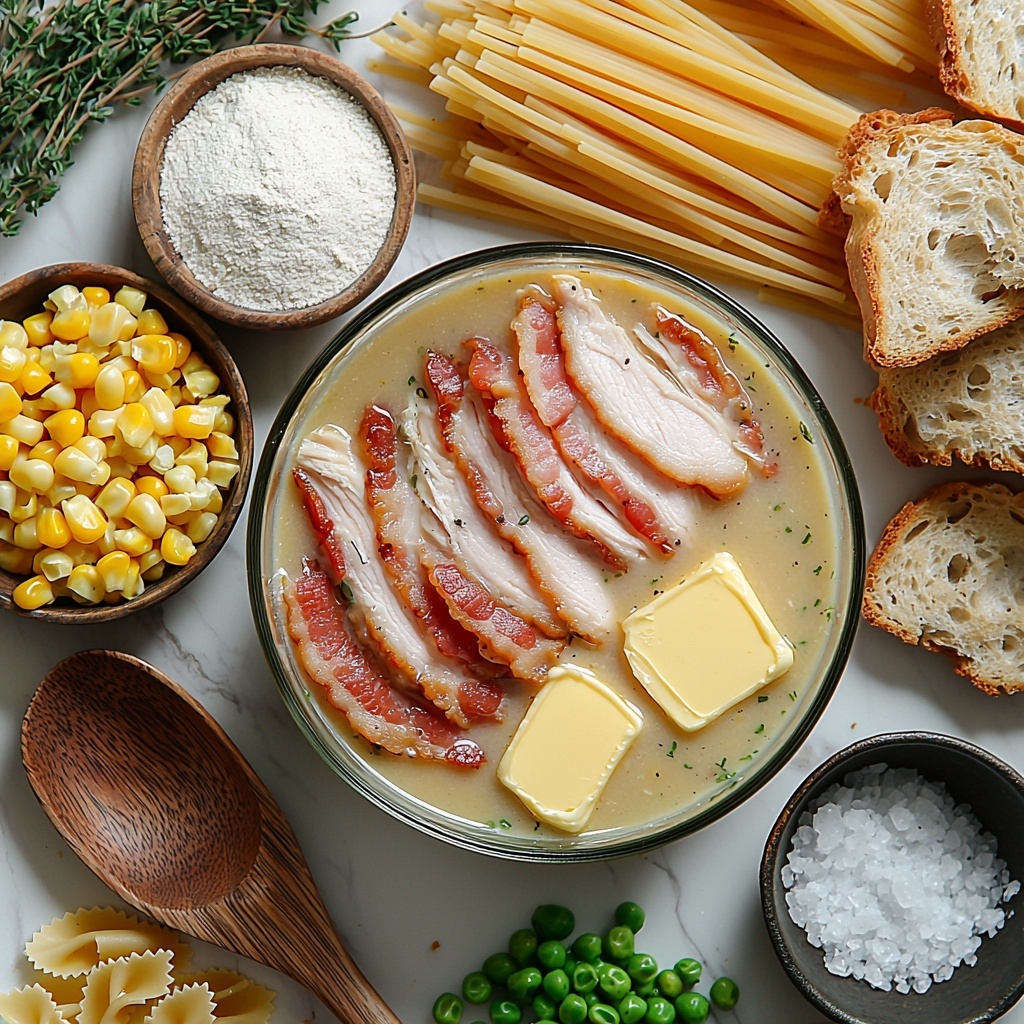What I love about this Creamy Chicken Noodle Soup with Mini Croutons Recipe is how simple yet thoughtfully chosen the ingredients are. Each one plays a crucial role—whether it’s the smoky bacon fat lending depth, the fresh vegetables building layers of flavor and color, or the creamy milk base that brings it all together with luscious smoothness.