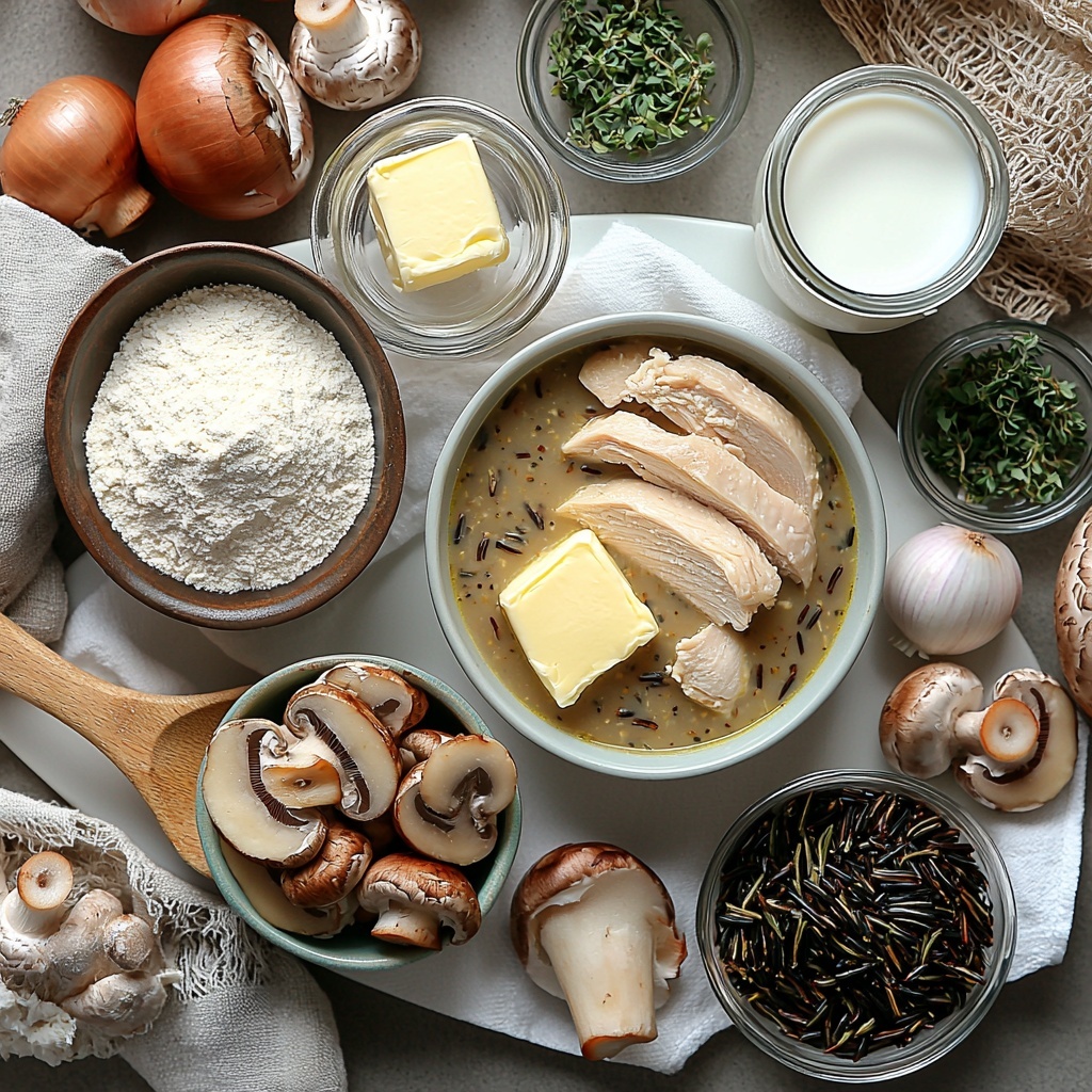 Gathering simple, wholesome ingredients is the first step toward making this Creamy Mushroom Chicken and Wild Rice Soup Recipe shine. Each item plays a key role — from the savory mushrooms offering earthiness, to the fresh herbs layering the dish with fragrant notes, and the wild rice adding a delightful chewiness.