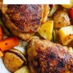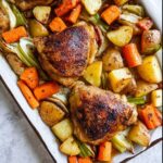 This flavorful recipe for Crispy Roasted Chicken Thighs with Veggies combines bone-in, skin-on chicken thighs marinated in a savory blend of garlic, soy sauce, honey, and ginger, roasted alongside hearty Yukon gold potatoes, sweet potatoes, carrots, celery, and shallots. The result is a perfectly crispy chicken skin and tender, caramelized vegetables, making it a wholesome, fulfilling dinner option that’s easy to prepare in one pan.