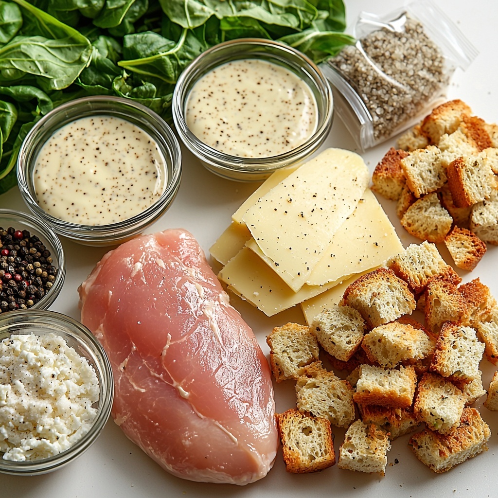 This Easy Baked Caesar Chicken Recipe uses straightforward ingredients that come together effortlessly yet deliver impressive layers of flavor and texture. Each component plays a crucial role, from the creamy dressing that ensures moistness to the provolone’s mellow meltiness and the croutons that add that irresistible crunch.