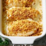 - Bake Chicken: Place the baking dish on the center rack of the oven and bake for 25 to 30 minutes, or until the chicken reaches an internal temperature of 165°F (74°C) and the toppings are golden brown. If the crouton topping browns too quickly, loosely tent the dish with foil for the remaining baking time to prevent burning.