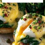Carefully remove the poached eggs from the water and gently pat them dry on a paper towel to avoid watery plates. Now comes the fun part: place the toasted English muffins on your plate, layer a generous handful of sautéed spinach, and nestle each poached egg on top. Spoon over the warm hollandaise sauce, letting it cascade beautifully over the eggs and greens.