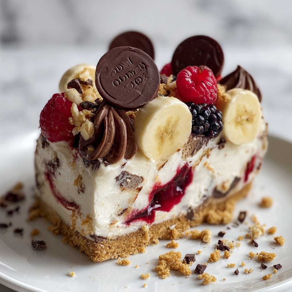 A delightful and easy-to-make no-bake banana split cheesecake featuring a creamy cream cheese filling layered with fresh bananas, crushed pineapple, maraschino cherries, and topped with chocolate and caramel sauces. Perfect for a refreshing dessert that captures the flavors of the classic banana split.