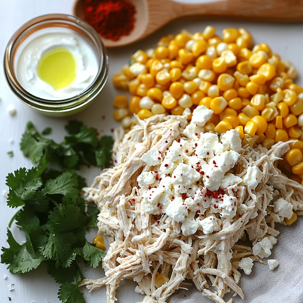Now it’s time to bring everything together. In a large bowl, mix the shredded chicken, charred corn, chopped cilantro, and crumbled feta cheese if you’re using it. Pour your creamy dressing over the salad and toss gently to coat every strand and kernel with flavor. This step is where the High Protein Chicken Street Corn Salad Fresh Creamy Low Calorie Recipe shines by marrying all elements into a harmonious dish.