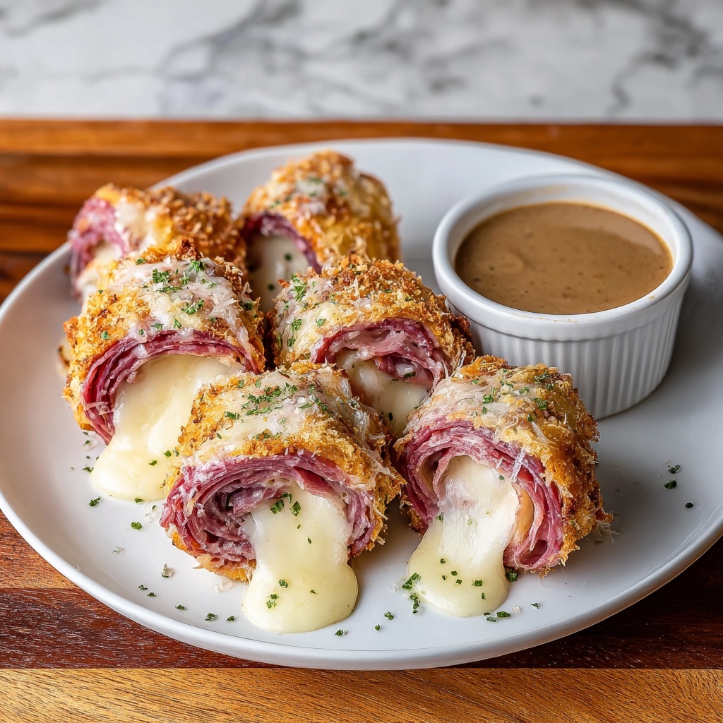 Brighten your Keto Crispy Reuben Roll-Ups Recipe with fresh garnishes like finely chopped chives or parsley to add a pop of color and a hint of fresh herbaceousness. A sprinkle of extra paprika on top works beautifully too, enhancing both the visual appeal and smoky flavor.