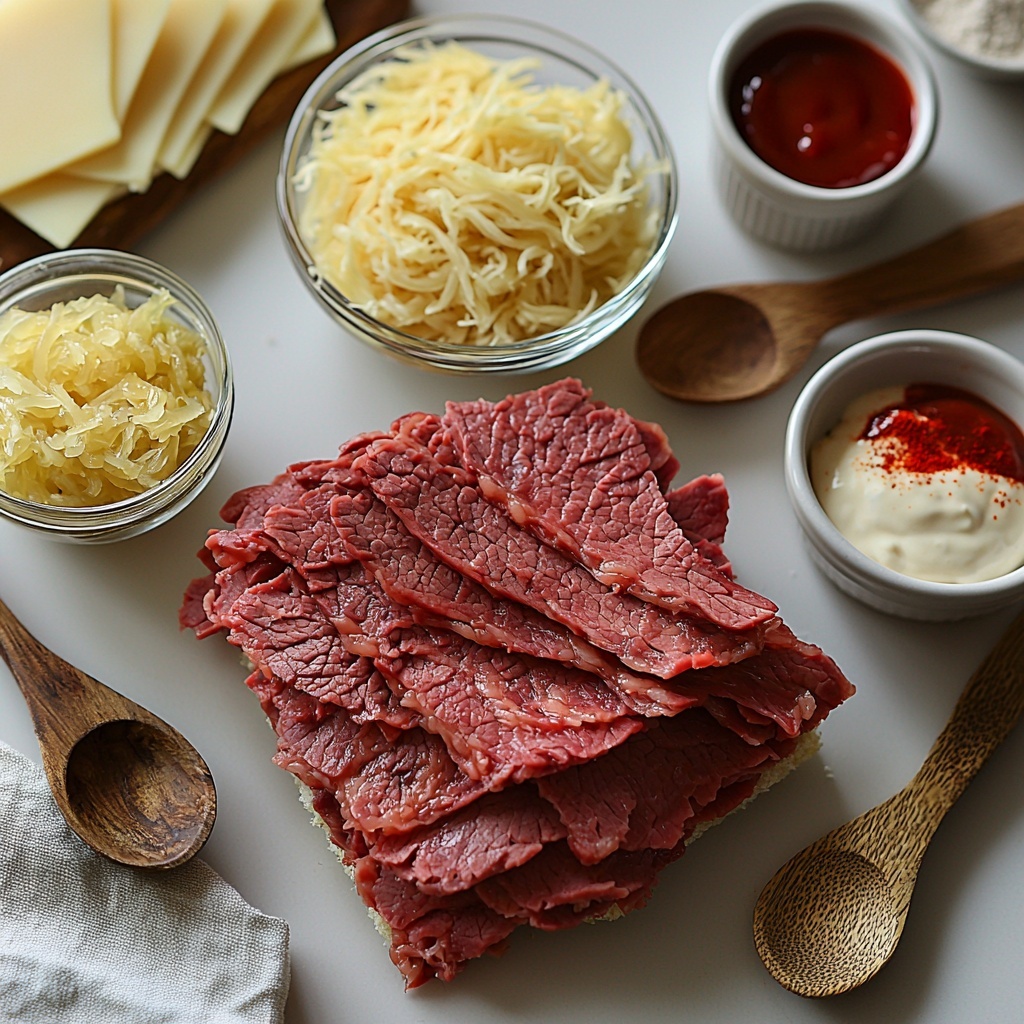 Gathering your ingredients for this recipe is a breeze, and each component plays an essential role in bringing texture, tang, and flavor harmony. The magic starts with shredded Swiss cheese creating the crispy base, while the corned beef and sauerkraut deliver that classic Reuben punch. The dressing blends creamy, sharp, and slightly sweet notes that really elevate the roll-ups.