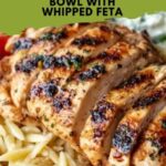 7. Assemble the Bowls: Divide the orzo mixture into bowls, top with sliced grilled chicken, and add a generous dollop of lemon whipped feta on each serving. Serve immediately for best flavor.