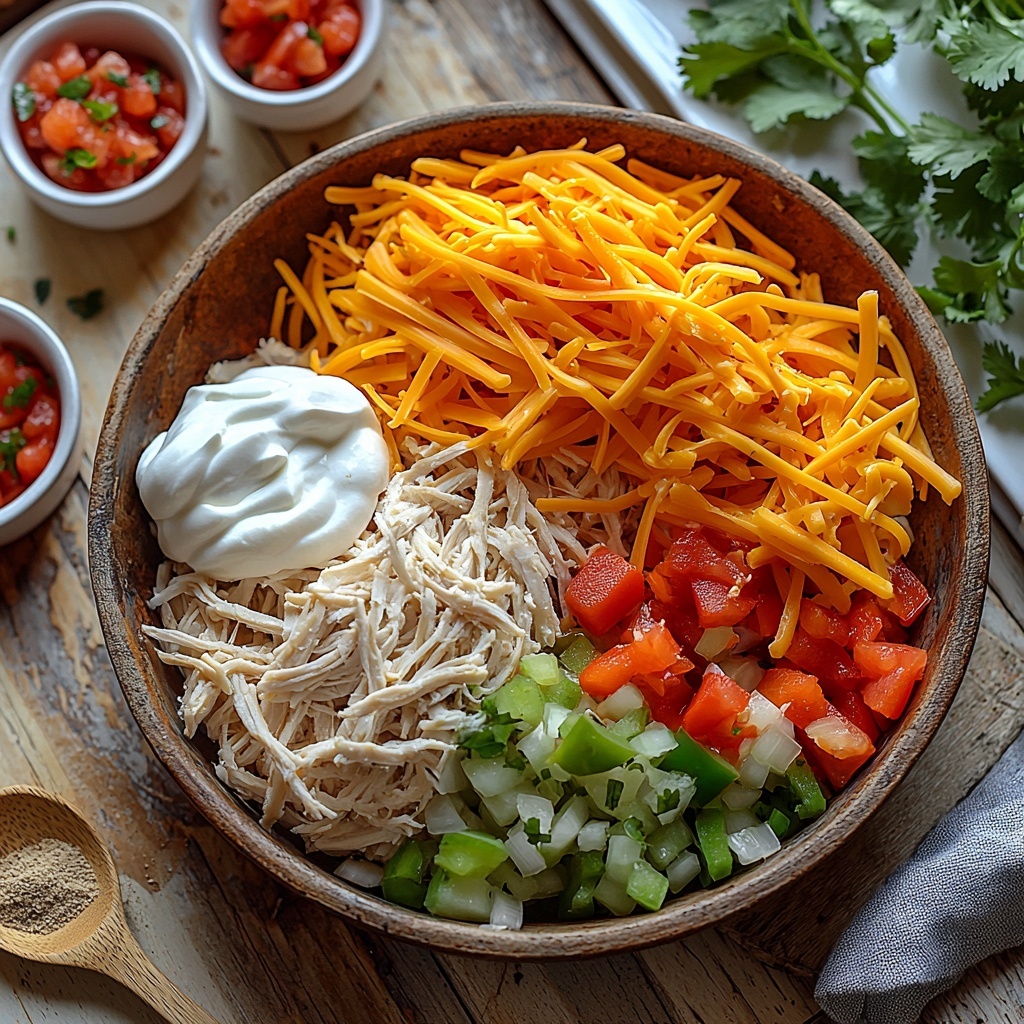 - Mix Ingredients: In a large mixing bowl, combine the shredded chicken, diced bell peppers, diced onions, taco seasoning, garlic powder, onion powder, sour cream, and salsa. Mix thoroughly to blend all flavors together.