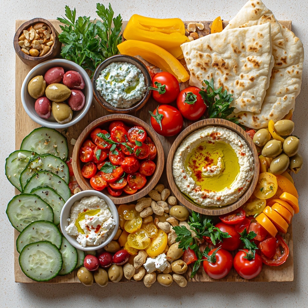 Create a vibrant Mediterranean Brunch Board featuring house-made dips like hummus, tzatziki, baba ganoush, and roasted red pepper dip, paired perfectly with fresh vegetables, olives, feta cheese, mixed nuts, and assorted pita and flatbreads. This colorful platter is ideal for sharing and offers a delicious balance of creamy, tangy, and crunchy Mediterranean flavors.