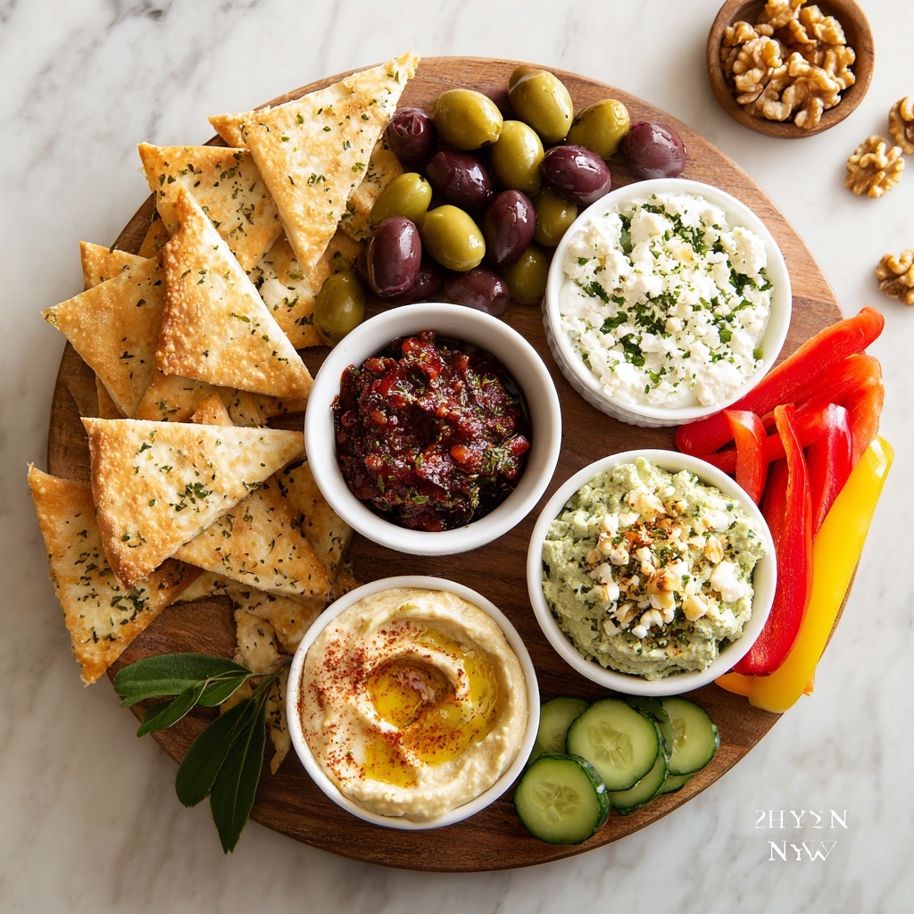 Fresh herbs such as oregano, parsley, or mint are beautiful and enhance the bright, herbal notes of the dips and veggies. A simple drizzle of good olive oil adds a glossy finish and richness that invites everyone to dive in.
