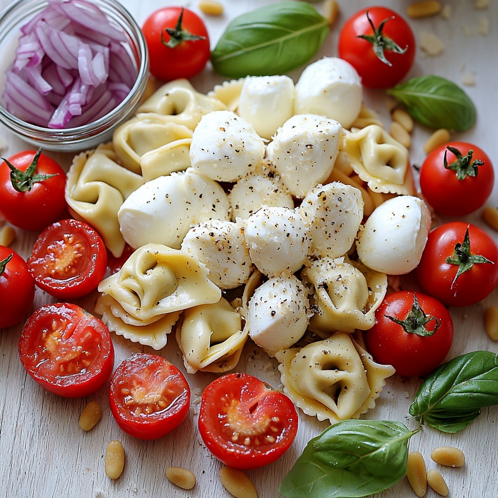 While the tortellini cools, halve your cherry tomatoes to release their juicy sweetness. Finely dice the red onion to add crunch without overwhelming the palate. Drain any liquid from your mozzarella balls to prevent the salad from getting watery, and roughly chop fresh basil leaves to maximize their bright aroma. Toast the pine nuts in a dry pan until golden and fragrant — this step really boosts their nutty flavor.