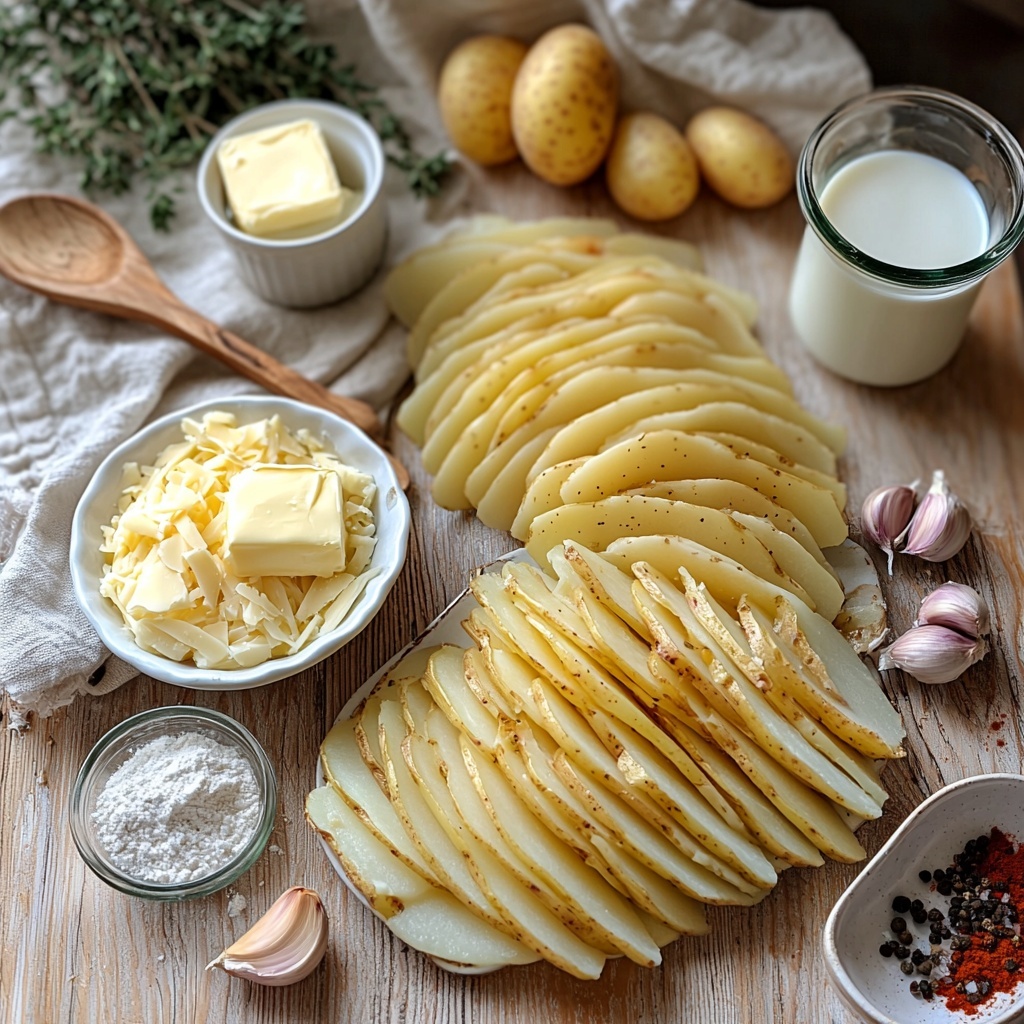 Getting to know your ingredients is the first step to mastering this Potatoes au gratin Recipe. Each one plays a crucial role, from the velvety sauce to the crispy, cheesy topping, making this dish truly irresistible.