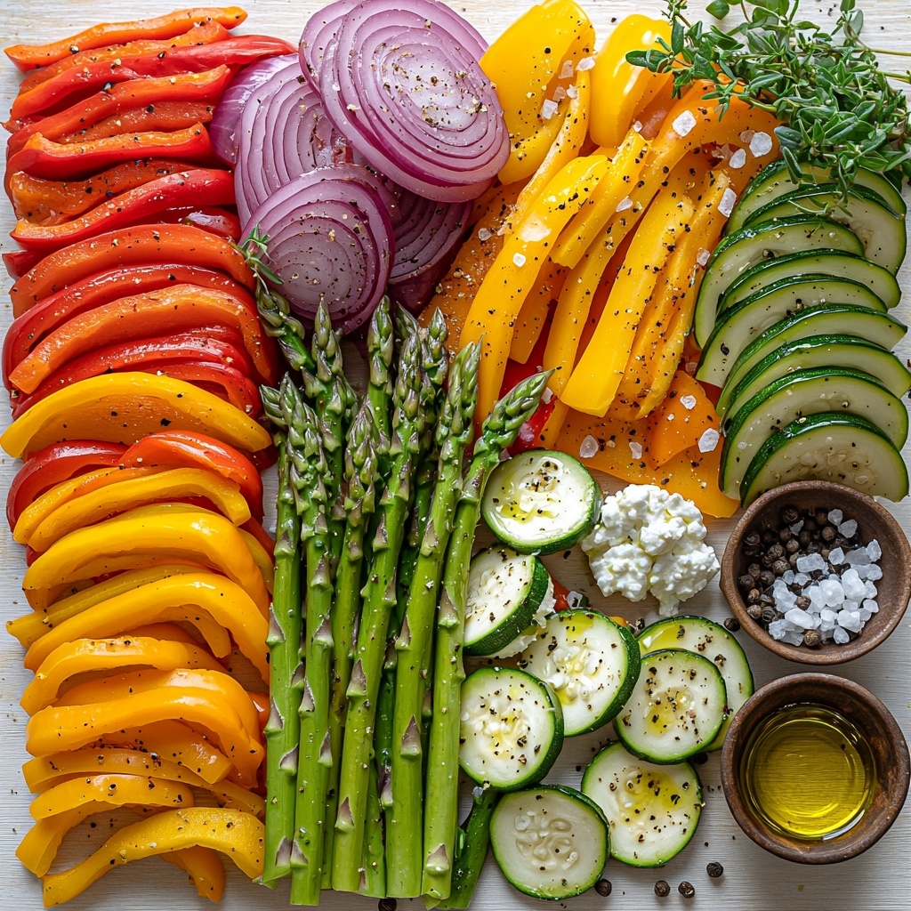 Slice the bell peppers into strips, cut the red onion into wedges, slice the zucchini into half-moons, and trim the tough ends off the asparagus. Uniform cuts help the vegetables cook evenly and look gorgeous when plated.