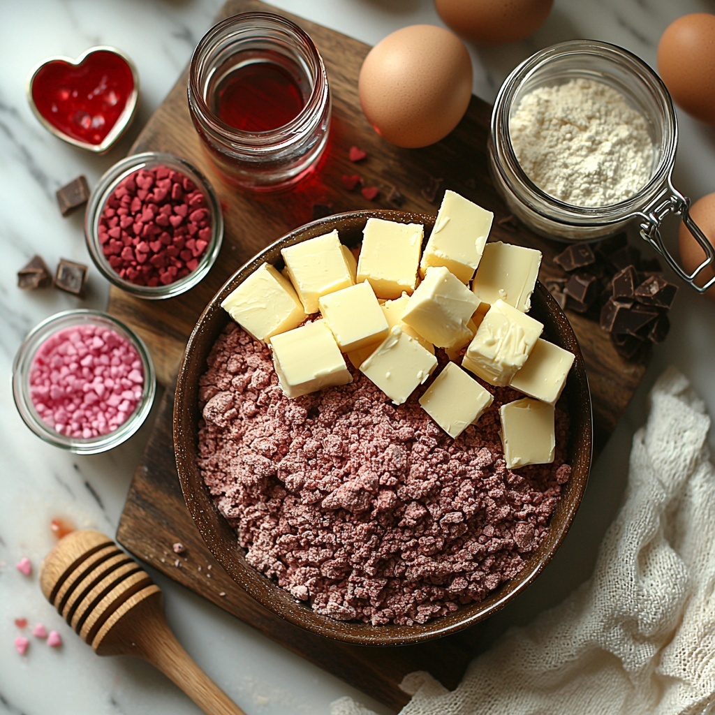 Start by whisking together the flour, cocoa powder, baking soda, baking powder, and salt in a bowl – these dry ingredients lay the groundwork for your cookie’s texture and flavor. In a separate large mixing bowl, cream the softened butter and sugar until it’s fluffy and light, which is key for that tender crumb. Then blend in the vanilla extract, honey, and white vinegar. Next, add the eggs one at a time, making sure they’re fully incorporated. Finally, stir in the red gel food dye and gradually fold in the dry mixture. The dough should be smooth and gorgeous with a vibrant hue.