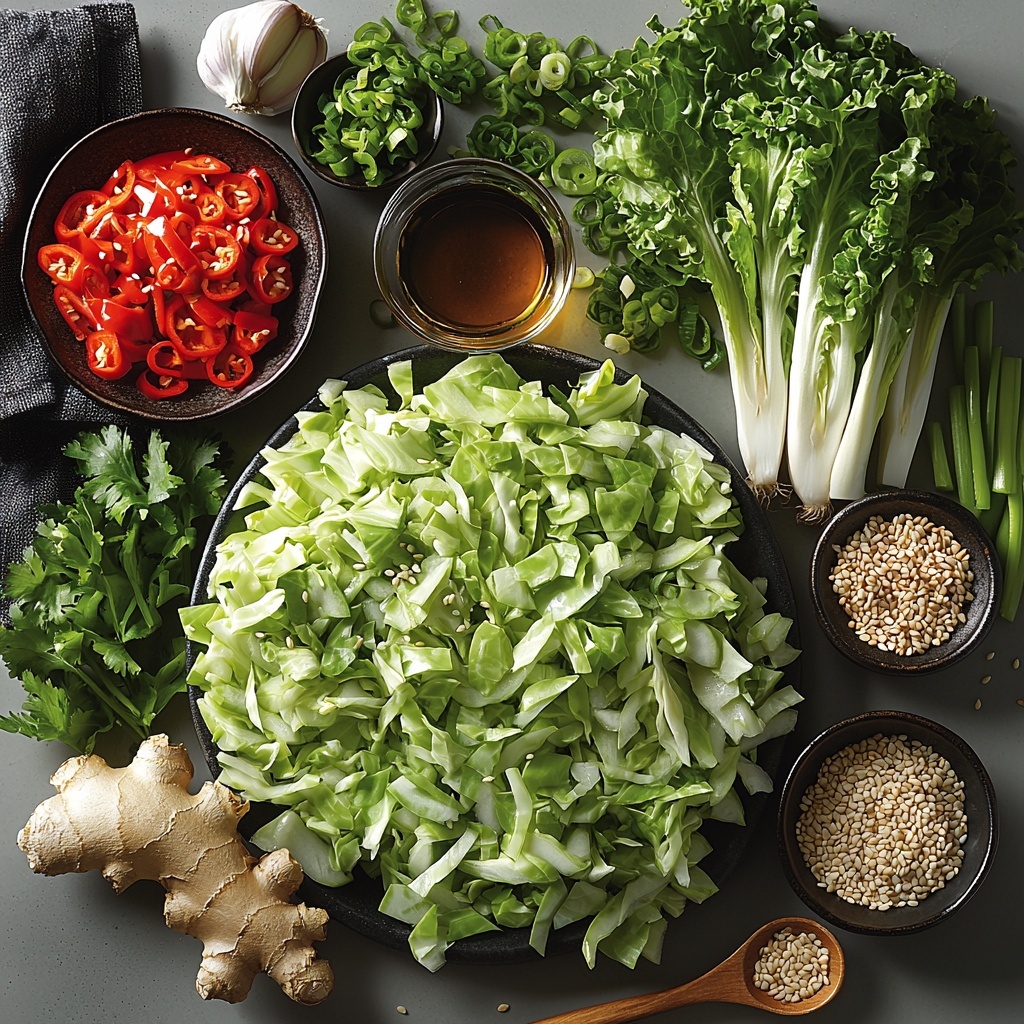 • Green cabbage (1 small head, thinly sliced): The star of the dish, providing crunch and mild sweetness that carries all the flavors beautifully.