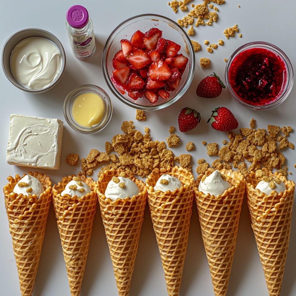 The ingredients for this Strawberry Crunch Cheesecake Cones Recipe are wonderfully simple but absolutely essential. Each one plays a crucial role, from building the luscious cheesecake filling to creating that perfect crunch and stunning presentation.