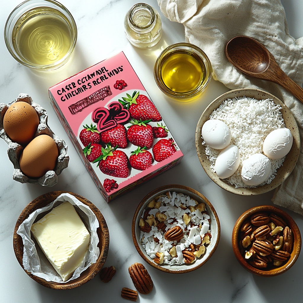 This recipe is all about simple yet essential ingredients that come together to create a stunning balance of flavors and textures. Each component plays a vital role, whether it’s the moist strawberry cake base, the creamy tang of the cream cheese swirl, or the sweet crunch from the toppings. Here’s what you’ll need to make this irresistible dessert: