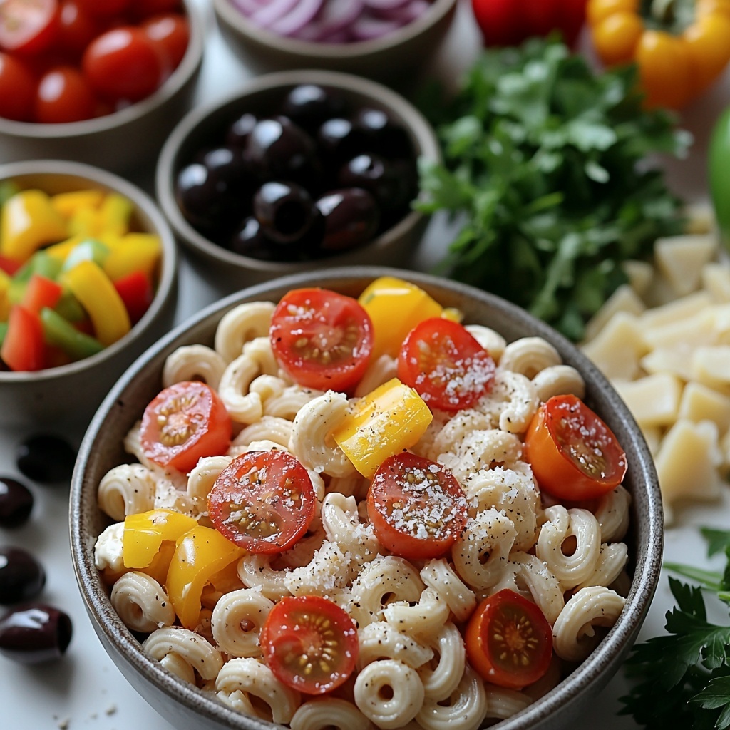 - Combine ingredients: Carefully add the cooled macaroni to the dressing, along with cherry tomatoes, red onion, black olives, bell peppers, parsley, and Parmesan cheese.