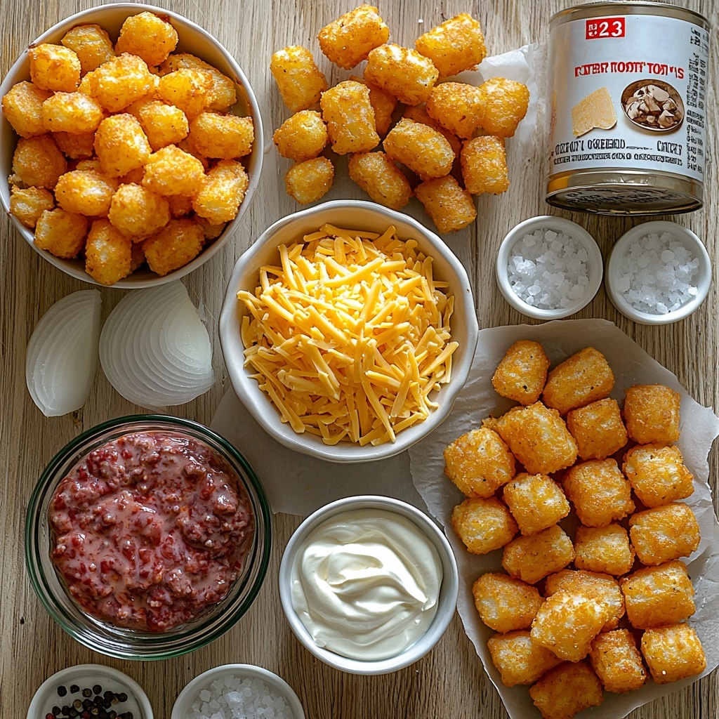 This Tater Tots Casserole Recipe is wonderfully simple, relying on a handful of essential ingredients that each play a crucial role in the final dish. From the rich, seasoned ground beef base to the creamy mushroom and sour cream combo, every component layers in texture and flavor before the crispy tater tots top it all off.