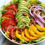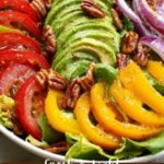 Arrange slices of creamy avocado and juicy heirloom tomatoes on top of the greens with care, making the salad not just delicious but visually inviting. Next, spoon the marinated red onions over everything, reserving some dressing to drizzle later. These toppings add layers of flavor and texture that sing together beautifully.