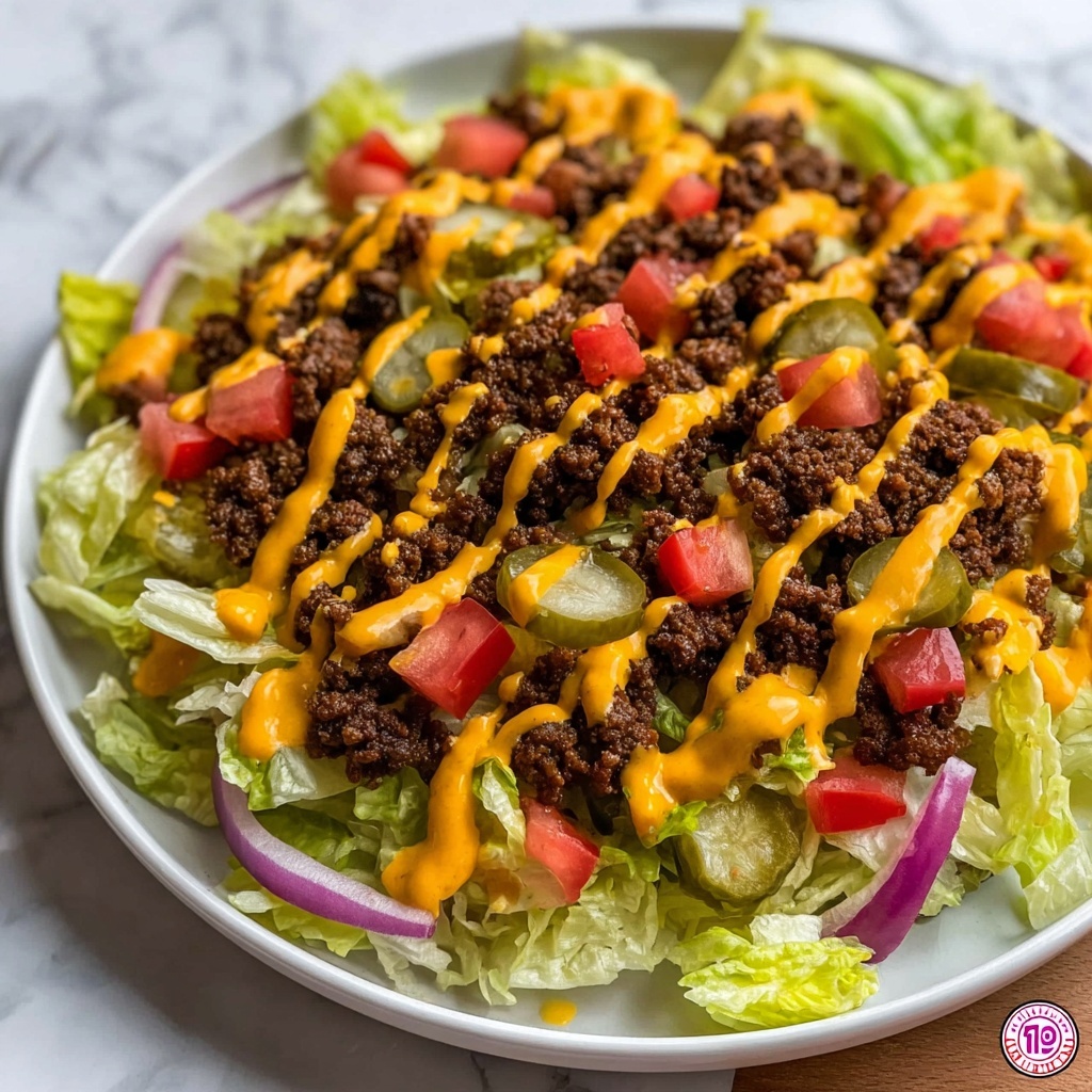 A delicious and keto-friendly twist on the classic Big Mac, this salad combines savory ground beef, fresh veggies, shredded cheddar, and a creamy Big Mac sauce for a satisfying low-carb meal ready in just 20 minutes.