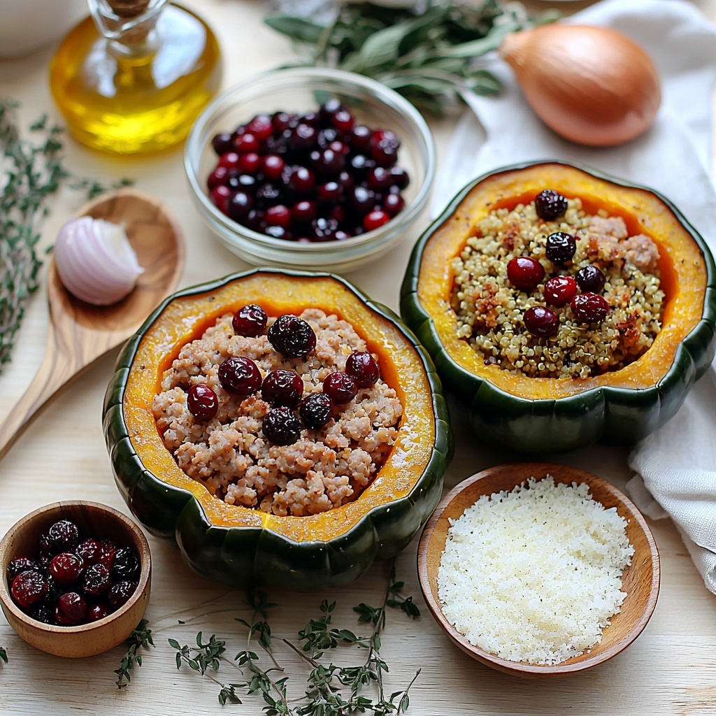 Start by preheating your oven to 400°F (200°C). Cut each acorn squash in half lengthwise and scoop out the seeds to create perfect little boats. Brush the insides with olive oil and sprinkle with salt and pepper—this not only adds flavor but helps the squash develop a lovely caramelized surface. Place the squash halves cut-side down on a baking sheet and roast them for 20 minutes. This initial roasting softens the flesh so it’s tender but still sturdy enough to hold the filling.