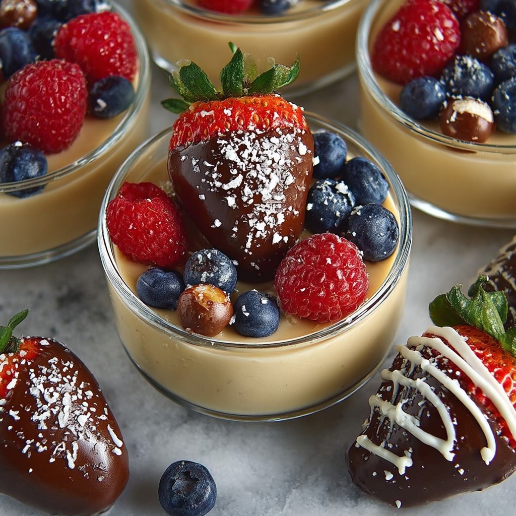 - Assemble & Serve: Once the pudding cups are firm, garnish each with the chocolate-dipped berries. Serve chilled and enjoy the lush, silky texture with the burst of fresh berries and chocolate.