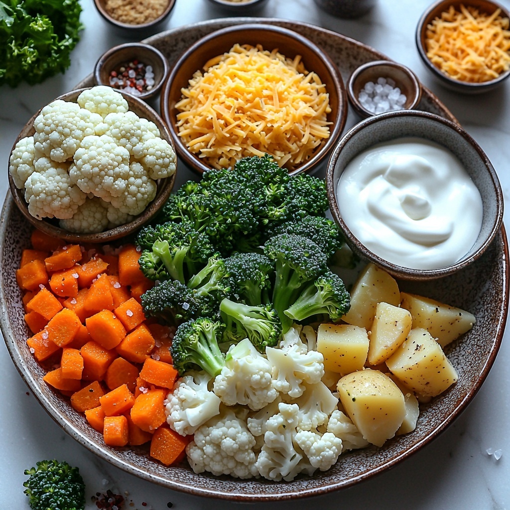 A comforting winter vegetable casserole featuring a hearty mix of broccoli, cauliflower, carrots, and potatoes baked in a creamy, seasoned sauce topped with melted cheese. This easy-to-make dish is perfect for cozy family dinners and offers a warm, flavorful way to enjoy seasonal vegetables.