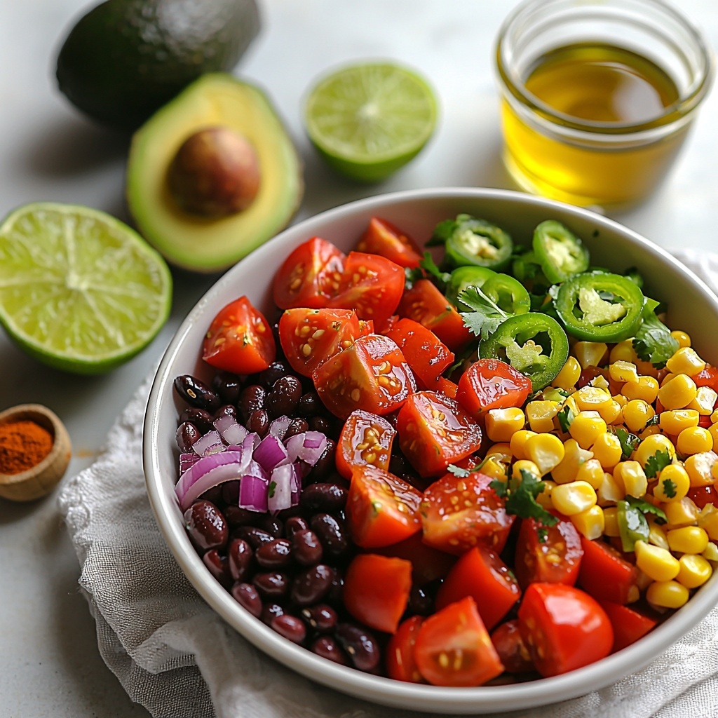 - Combine Ingredients for Flavor Layering: In a large mixing bowl, start by adding the black beans and corn kernels. Next, add the diced red onion, tomatoes, and chopped jalapeños. Sprinkle the ground cumin, garlic powder, and salt over the mixture. Finally, add the fresh cilantro, lime juice, and olive oil. If using, gently fold in the diced avocado for creaminess. Mix everything thoroughly but gently to combine flavors without mashing the ingredients.