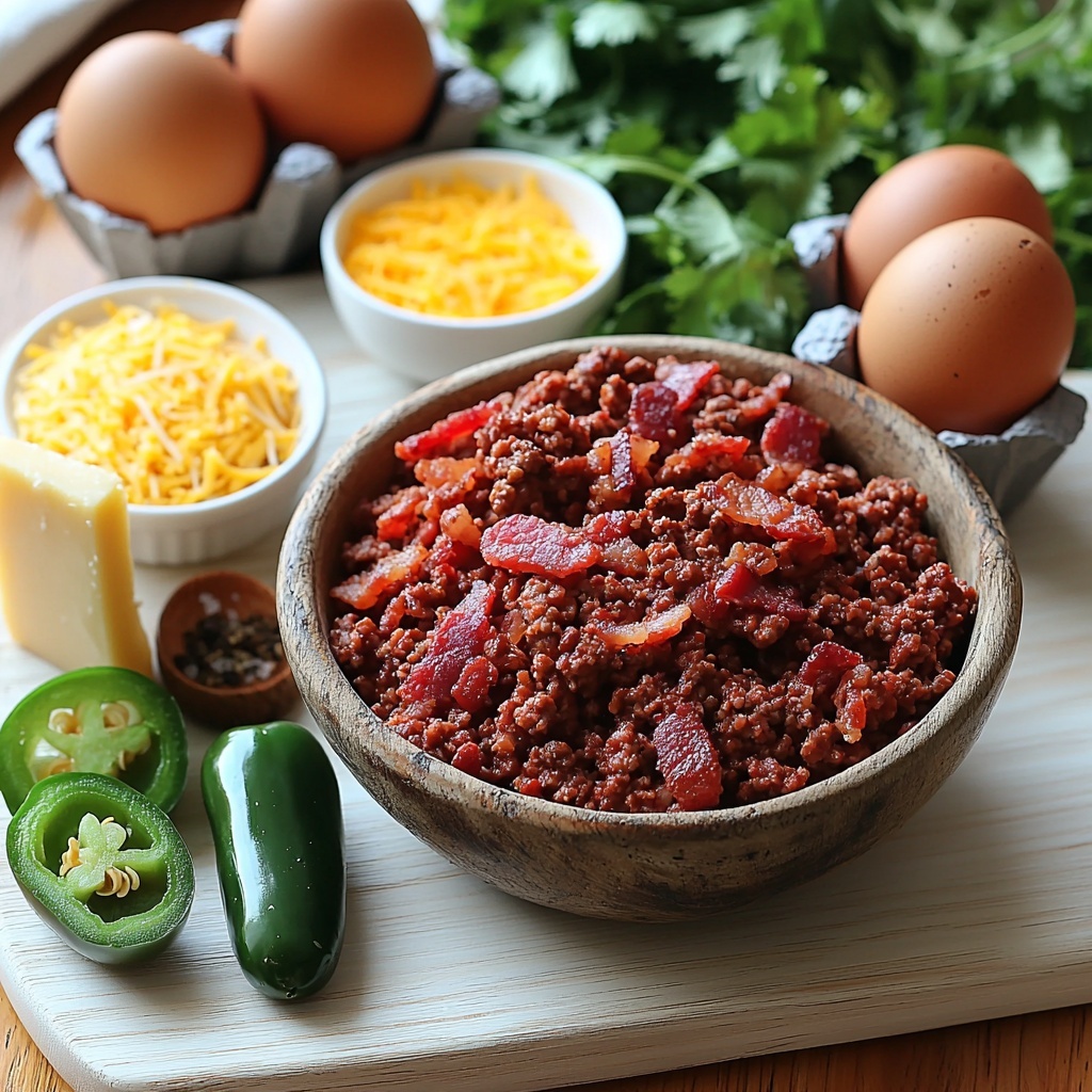 2. Mix Ingredients: Gather all ingredients into a large mixing bowl. Mix the ground beef, diced jalapeños, creamy cheese, crumbled bacon, smoky paprika, eggs, and seasonings thoroughly until well incorporated to distribute flavors evenly.